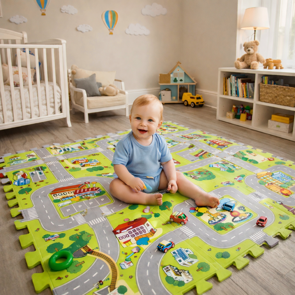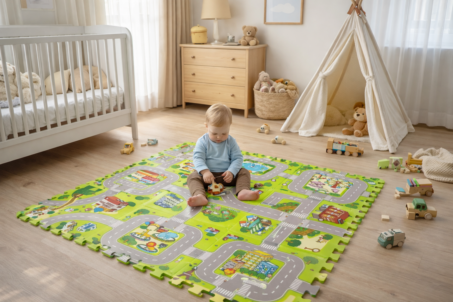 Tapis de jeu puzzle enfant avec dalles emboîtables – circuit routier et ville