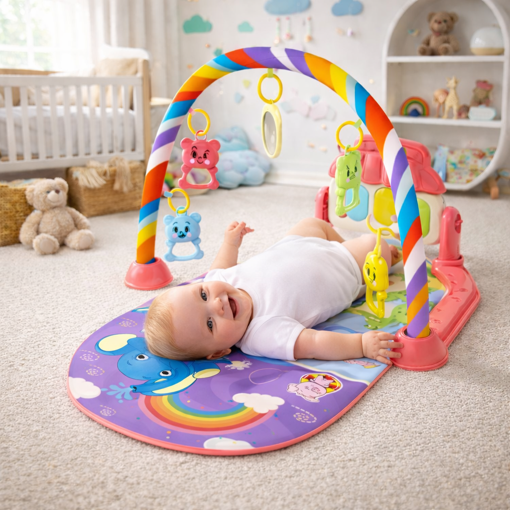 Tapis d’éveil bébé avec arche multicolore, jouets suspendus et miroir